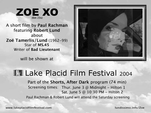 ZOE XO was first screened at the Jan. 2004 Slamdance Film Festival as part of its "$99 Special" series of short works (made on a $99 budget). It was reportedly well-received by the Slamdance audience. In June 2004, the Lake Placid Film Festival brought Paul and Robert up for another screening of the film. When we arrived on Friday night, people who had seen the Thursday night screening praised it highly, providing encouragement for the feature-length documentary about Zoë being planned. At Saturday's screening (the first time I had seen the piece on a large screen with an audience), many people were moved by the story and the beautifully edited video.